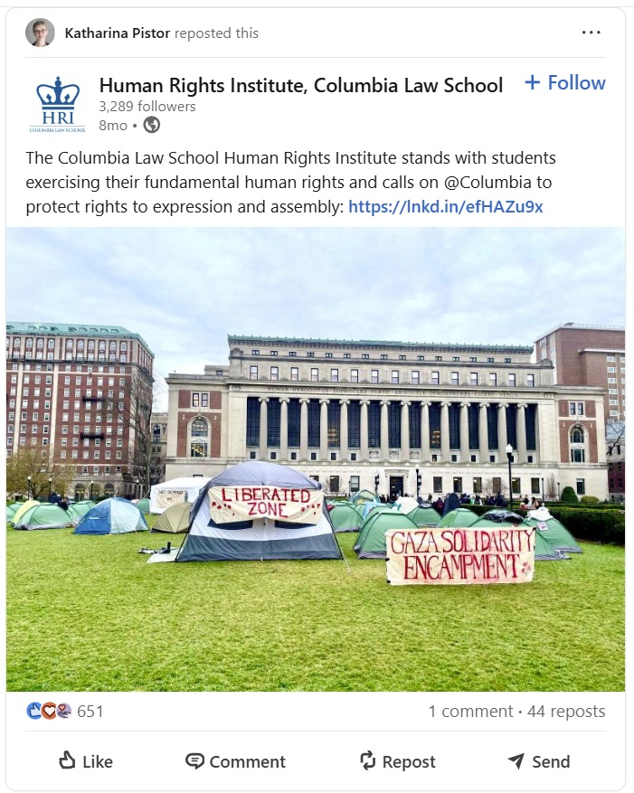 Of these five, Professor Pistor has expressed public support for the encampments, which would likely have been disqualifying if the UJB were a real jury.